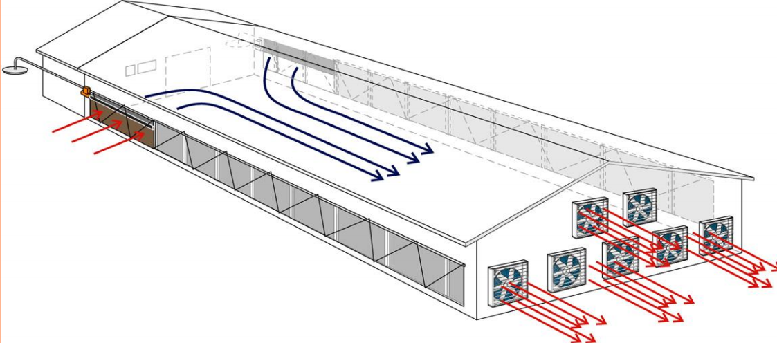 縱向通風(fēng):通過(guò)風(fēng)機冷效和濕簾降溫。通風(fēng)系統的計算應根據豬只體重,階段以獲得需求的風(fēng)速。